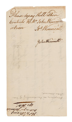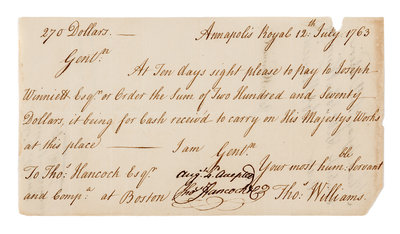 HANCOCK, John (1737-1793). Autograph note signed ("Accepted/Tho. Hancock"), to Thomas Hancock and Company Boston. Annapolis Royal, 12 July 1763.