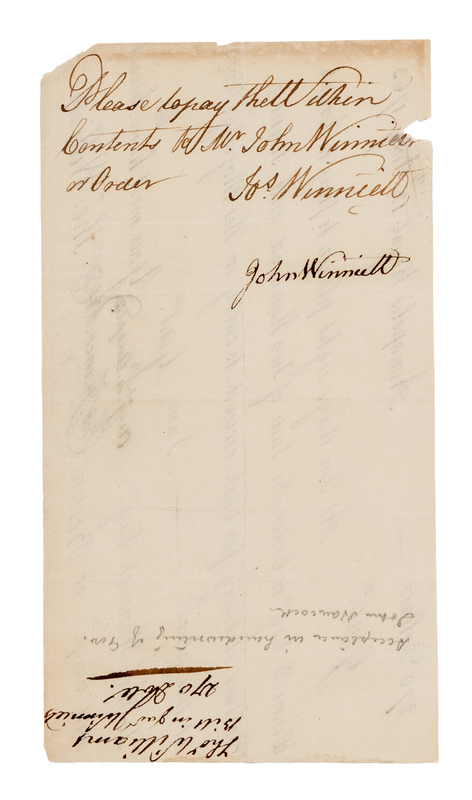 1 page, 8vo (104 x 189 mm), docketed by Hancock on verso, blank lower right corner chipped away, top edge with light chipping touching a letter, fold touched "k" in signature, creased, light pencil notation on verso. John Hancock, acting as representative of his uncle Thomas Hancock's shipping business, signs receipt in the name of his uncle, with his familiar signature and paraph. After John Hancock's father passed away, his uncle, Thomas Hancock, adopted him. Thomas Hancock taught John the shipping business, and when he passed away at the age of 62 (the summer after this receipt was signed), his business and most of his fortune passed to his nephew John, as he had no children; this inheritance made John Hancock one of the richest men in the colonies.