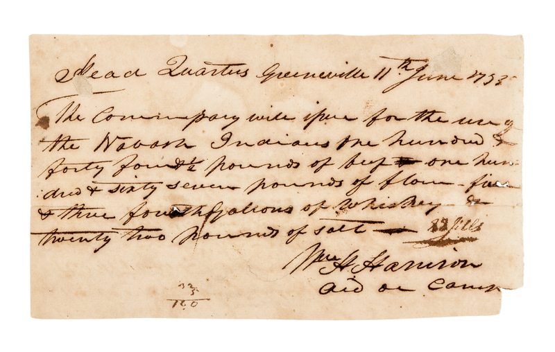 1 page, 8vo (117 x 201 mm), small hole upper left touching two words, toned, 1cm portion of lower right corner just touching a letter lacking, 1-in portion of left margin torn away but present touching four lines of text. Harrison directs the commissary to issue beef, flour, whisky and salt for the use of the Wabash Indians. Harrison became Aide-de-Camp to General Anthony Wayne in 1793, after receiving his commission as Ensign in the 1st Infantry in 1792 from President George Washington, his father's friend. He studies medicine at Philadelphia's College of Physicians and Surgeons, and despite the objections of his guardian, Robert Morris, he fought in the 1794 Indian Wars. One June 16, 1795, 5 days after Harrison issued this request, General Wayne opened peace negotiations at Greenville. The Treaty of Greenville was signed on August 3rd.