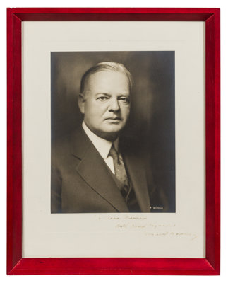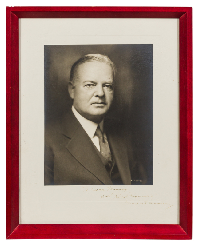 9 1/4 x 7 1/4 in black and white photograph, signed and inscribed in lower margin, small crease to lower left corner; framed. "To Nora Mamix with Kind Regards, Herbert Hoover."