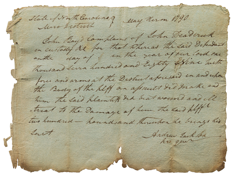 1 page, 4to, correction in Jackson's hand to the date, browned and frayed at edges with some nicks, hole in lower blank margin, vertical folds slightly toned (slightly affecting a letter in the signature), docketed on verso. The 23 year-old Jackson details John Boyd's legal complaint of assault against John Deadcreek. An early legal document during his time in Nashville, where he established a legal practice specializing in debt collection with friend John McNairy.