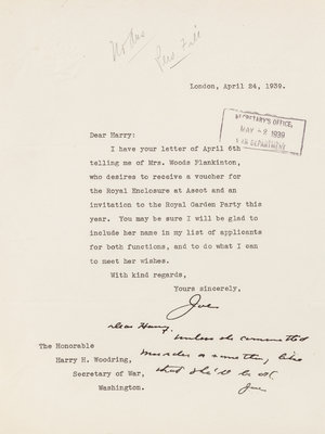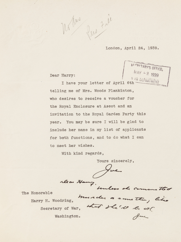 1 page, 4to, Embassy of the United States of America and Seal of the United States in blind , rubber-stamped "Secretary's Office May -2 1939 War Department" upper right, lightly creased with horizontal fold touching the "J" in the first signature, short tear upper left, pencil notations in an unknown hand upper center. Kennedy writes Woodring about an invitation for Mrs. Woods Plankinton to the Royal Enclosure at Ascot and an invitation ot the Royal Garden Party.