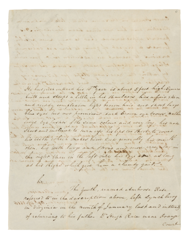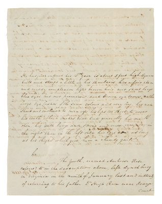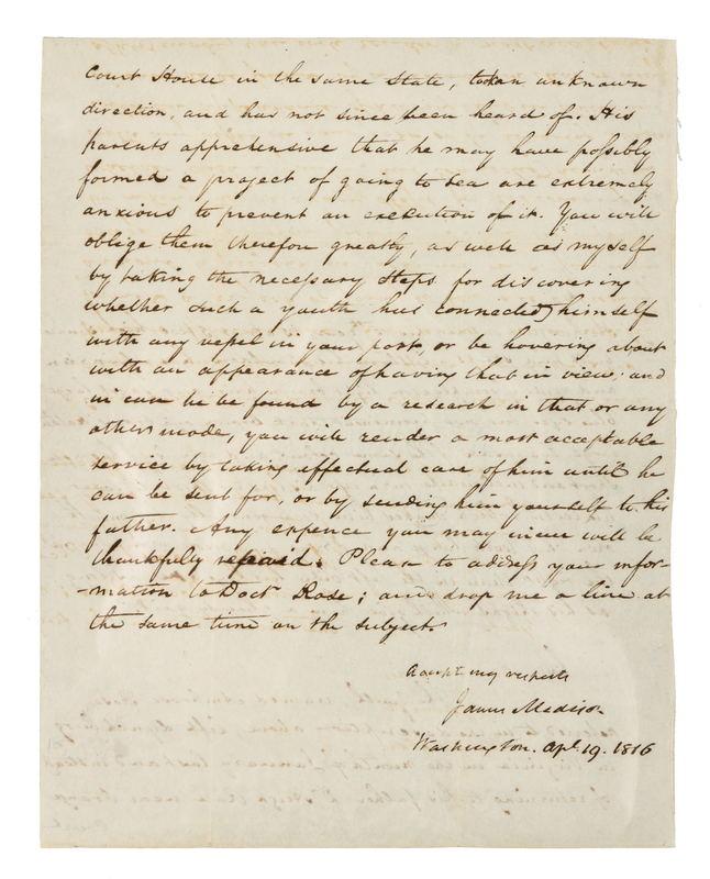 2 pages, 4to, written on recto and verso, some ink showthrough. Madison sends a letter hoping for help in locating his missing nephew, Ambrose Rose, son of his sister Frances Taylor Madison and Robert Hugh Rose of Lynchburg. "He has just entered his 15th year is a bout 5 feet high, square but and stoops a little in his shoulders [he] left Lynchburg in Virginia in the month of January last and instead of returning to his fathertook an unknown direction, and has not since been heard of. His parents apprehensive that he may have possibly formed a project of going to sea are extremely anxious to prevent an execution of it. You will oblige them therefore greatly, as well myself by taking the necessary steps for discovering whether such a youth has connected himself with any vessel in your port, or be hovering about with an appearance of having that in view"