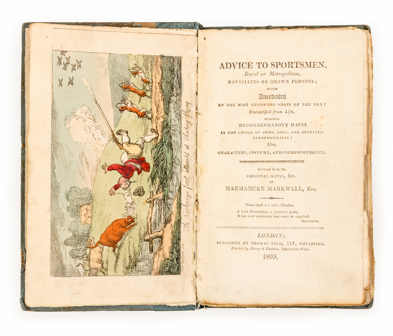 ROWLANDSON, Thomas, illustrator -- MAXWELL, Marmaduke, pseudonym. Advice to Sportsmen, Rural or Metropolitan, Noviciates or Grown Persons; with anecdotes of the most renowned shots of the day. London: Thomas Tegg, 1809.
