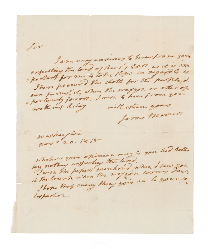 1 page, 4to, creased with a few holes or tears at folds occasionally touching letters. Arranging a land transaction with some urgency, Monroe writes: "I am very anxious to hear from you respecting the land of Shorr's Esq. as it is important for me to take steps in regard to it. I have procur'd the cloth for the people, and can furnish it when the waggon or other opportunity favors. I wish to hear from you without delay. Whatever your opinion may be you had better say nothing respecting the land. I wish the papers mentioned when I saw you and the grant(?) when the waggon comes down. I hope that every thing goes on to your satisfaction."