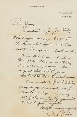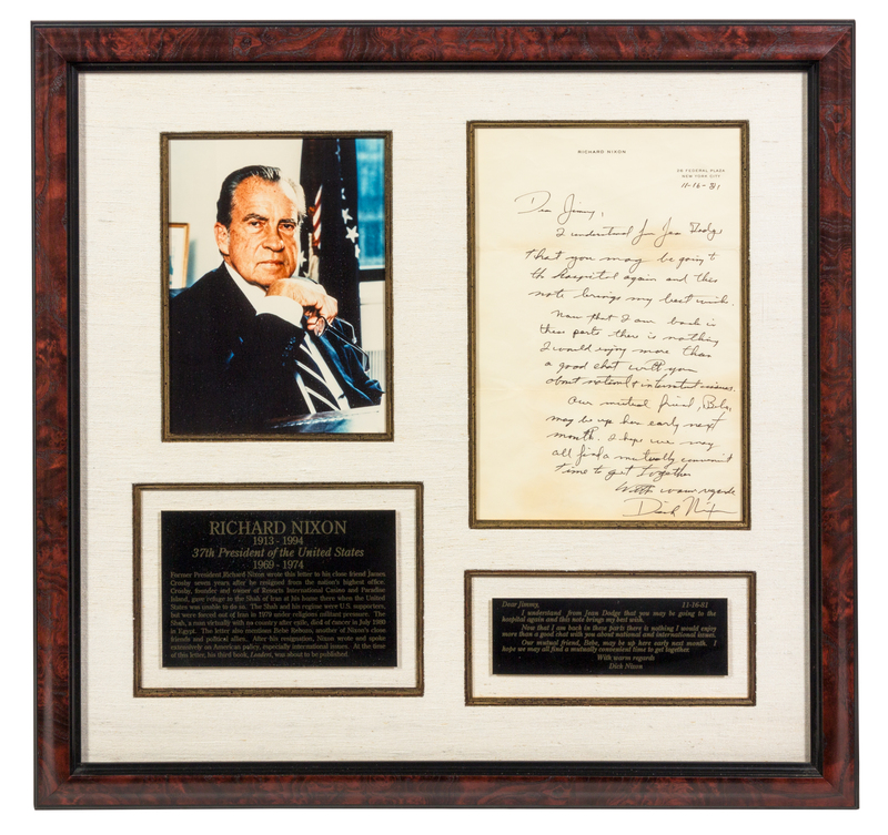 1 page, 8vo, on personal stationery, creased at folds, some pale stains; matted and framed. Nixon writes his good friend to wish him well upon hearing the news of his recent health issues. James Crosby was founder and owner of Resorts International Casino and Paradise Island, who gave refuge to the Shah of Iran at his home there when the United States was unable to do so. The letter mentions Bebe Rebozo, another of Nixon's close friends and political allies. "Now that I am back in these parts there is nothing I would enjoy more than a good chat with you about national & international issues. Our mutual friend, Bebe, may be up here early next month I hop we may all find a mutually convenient time to get together"