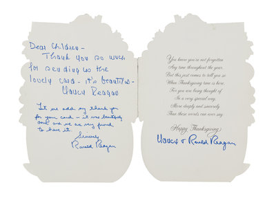 2 pages, 8vo (214 x 150 mm), on a printed card, twice signed, tipped to backing. "Dear Children - Thank you so much for sending us the lovely card - it's beautiful - Nancy Reagan." "Let me add my thank you for your card - it was beautifully done and we are very proud to have it. Sincerely, Ronald Reagan." Additionally signed under printed sentiment "Nancy and Ronald Reagan."
