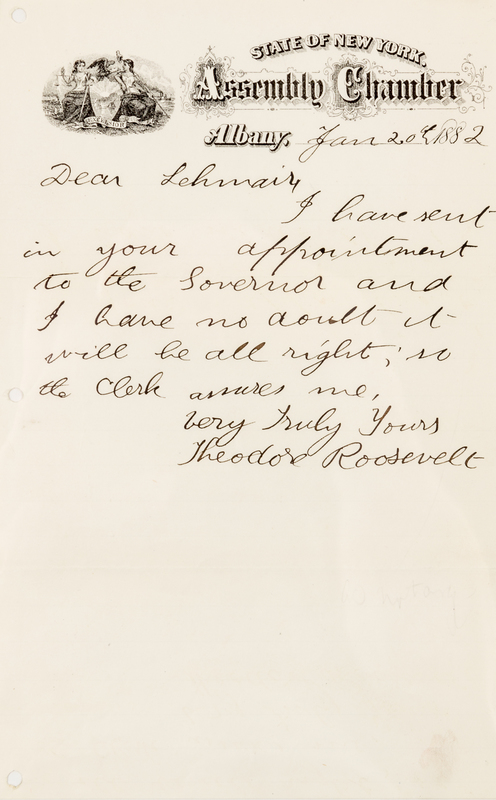 1 page, 8vo, on State of New York's Assembly letterhead, three holes punched in left margin. Confirming that he has sent Lehmaier's appointment to the Governor: "I have sent in your appointment for Governor, and I have not doubt it will be all right, so the Clerk assures me"