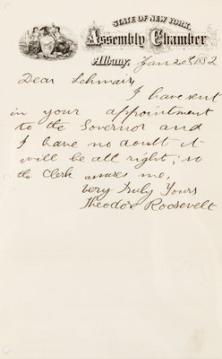 ROOSEVELT, Theodore (1858-1919). Autograph letter signed ("Theodore Roosevelt"), as Assemblyman, to James S. Lehmaier. Albany, 20 January 1882.