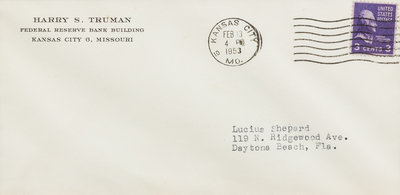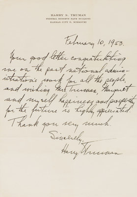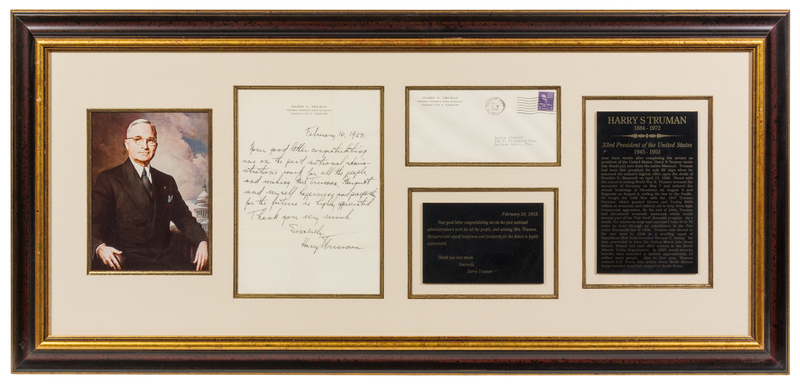 1 page, 8vo, with original holograph envelope, creased to folds, a few pale stains; matted and framed. Thanking Shepard for his well-wishes: "Your good letter congratulating me on the past national administration's work for all the people, and wishing Mrs. Truman, Margaret and myself happiness and prosperity for the future is highly appreciated"