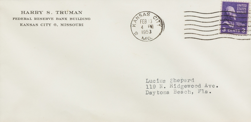 TRUMAN, Harry S. (1884-1972). Facsimile letter signed ("Harry Truman"), to Lucius Shepard. Kansas City, Missouri, 10 February 1953.