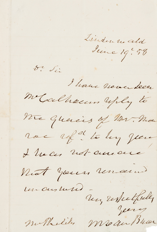 1 page, 8vo, some light spotting or creasing, left margin reinforced, pinholes upper right corner, small tear to lower left corner with small loss. Van Buren mentions that he has not seen John C. Calhoun's replies to James Monroe's inquiries, in full: "I have never seen Mr. Calhoun's reply to the queries of Mr. Monroe refd. to by you & was not aware that yours remained unanswered." John C. Calhoun served as James Monroe's Secretary of war from 1817 tho 1825, and as Andrew Jackson's Vice President. After falling out of favor with Jackson, Calhoun resigned as Vice President to return to the Senate, allowing Martin Van Buren to replace him as Jackson's running mate as Vice President in the 1832 election.