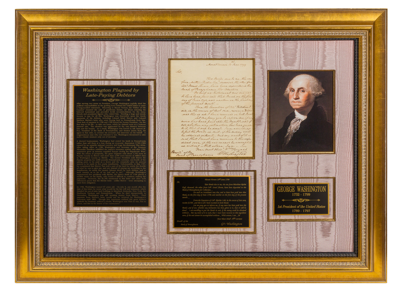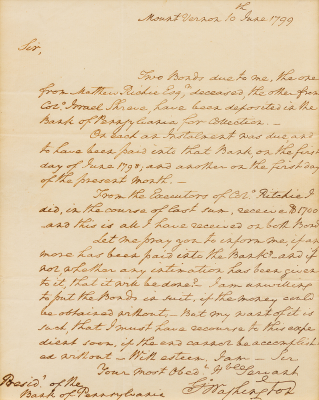 1 page, 4to, pinholes in upper corners; mats and frames available. Washington in retirement initiates his final effort to secure payment for remaining debts owed him from the sale of two of his land tracts in Pennsylvania.After returning home to Mount Vernon to enter his long-awaited retirement from political responsibilities and resume the role of gentleman farmer, the former President became embroiled in an effort to chase down debts owed on two land transactions in Pennsylvania. The larger Miller Run tract in Washington County, comprising 2,183 acres, was sold to Matthew Ritchie for $12,000 in 1796. The other the tract known as Washington's Bottom in Fayette County, comprising 1,644 acres, was sold to Col. Israel Shreve for 4,000 pounds Pennsylvania currency the previous year. Their failed annual payments due in 1798, and again in1799, prompted Washington to take further action and contact the President of the Bank of Pennsylvania, Samuel M. Fox, to intervene on his behalf:"Sir, Two Bonds due to me, the one from Matthew Richie [sic] Esqr., deceased, the other from Colo. Israel Shreve, have been deposited in the Bank of Pennsylvania for Collection. On each an Instalment was due, and to have been paid into that Bank, on the first day of June 1798; and another on the first day of the present month. From the Executors of Colo. Ritchie I did, in the course of last sum[mer], receive $1700-and this is all I have received on both Bonds. Let me pray you to inform me, if any more has been paid into the Bank? and if not, whether any intimation has been given to it, that it will be done?"Washington makes clear his preference to resolve the matter outside of court: "I am unwilling to put the Bonds in suit, if the money could be obtained without." But the clearly frustrated Washington concludes, "But my want of it is such, that I must have recourse to this expedient soon, if the end cannot be accomplished without."On June 13, Fox wrote to Washington reporting no payments had been made upon the bonds of Ritchie or Shreve, nor had any "intimation" been given of an intention to pay the installments due. Washington wrote Fox again on 26 June, asking him to forward a related letter to his agent in both sales, James Ross, and ends the letter: "It would distress me to be obliged to put the judgment Bonds of the above named persons in Suit, but necessity will drive me to it if I cannot obtain payment, & shortly, without" (Papers, Retirement Series, Vol IV, no. 159). By the time of his unexpected death in December 1799, Washington was still awaiting money from Shreve. Final payment from Shreve's heirs would not be received by Washington's executors until 1802.The Papers of George Washington Digital Edition. Charlottesville: University of Virginia Press, Rotunda, 2008. Retirement Series, Vol. IV, no. 112.