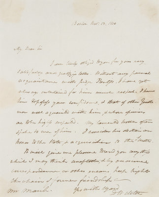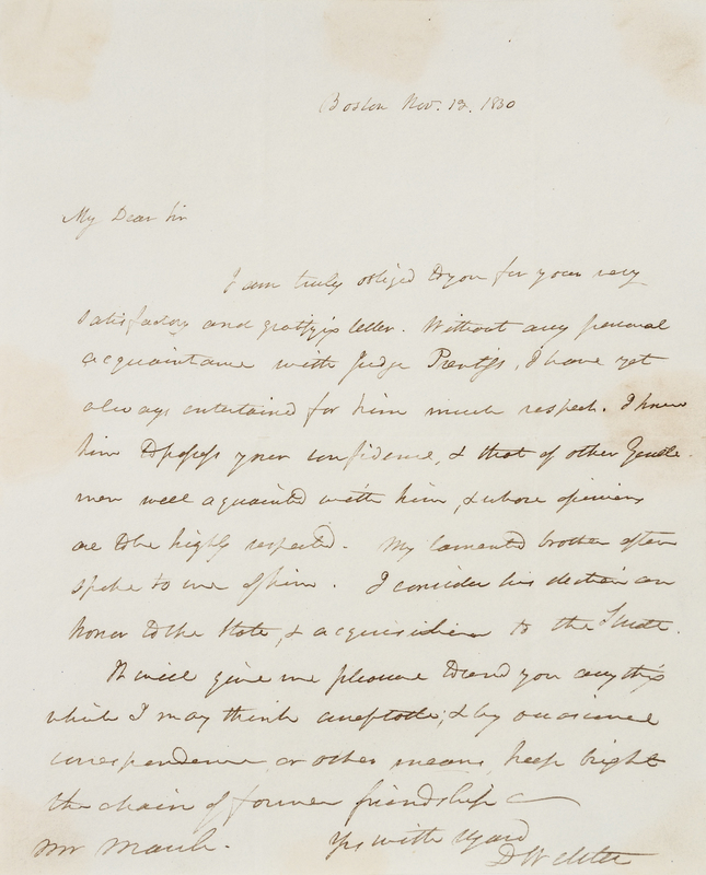 WEBSTER, Daniel (1782-1852). Autographed letter signed ("D. Webster") as Senator, to Mr. March. Boston, 13 November 1830.