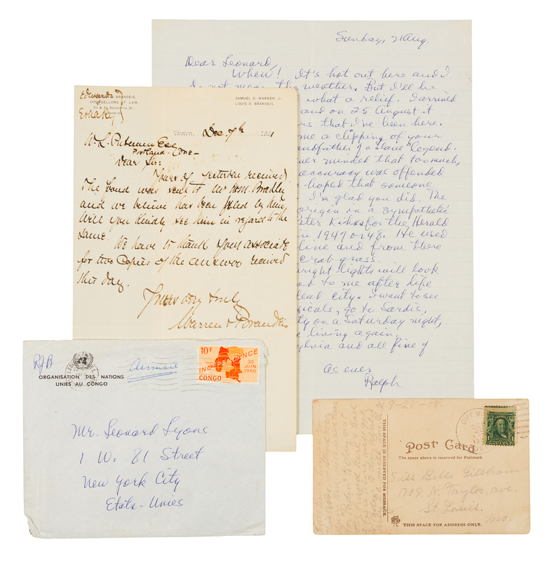 BRANDEIS, Louis (1856-1941) and Samuel D. WARREN (1852-1910). Autographed letter signed ("Warren & Brandeis"), to W.L. Putnam, Boston, 7 December 1881. 1 page, 4to, on Warren & Brandeis stationery, some ink offsetting. Writing regarding a bond filed by the recipient. -- BUNCHE, Ralph J. (1904-1971). Autograph letter signed ("Ralph"), to Leonard Lyons, Leopoldville, Congo, 21 August 1960. 1 page, 4to, with holograph envelope, lightly creased, paperclip impression upper margin. Bunche comments on one of Lyons' columns from The New York Times, and says he eagerly awaits his return to New York "to resume living again." -- NATION, Carry A. (1846-1911). Autograph letter signed ("C.N."), in pencil, to Belle Gillham, Okema, Oklahoma, 28 September 1908. 1 page, on verso of printed postcard showing the public school in Okemah, addressed in Nation's hand, postmarked. Nation tells her friend about recent travels and reports that she's headed to Paden, some 20 miles away. -- Together, 3 manuscripts.