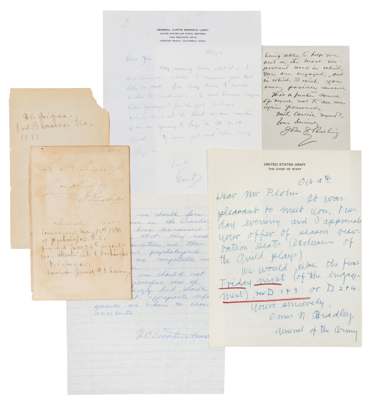 BRADLEY, Omar N. (1893-1981). Autograph letter signed ("Omar N. Bradley"), as General of the Army, to Mr. Plohn, n.p., 9 October, no year. 1 page, small 4to, on United States Army, The Chief of Staff stationery, red pencil underlining and light pencil erasures in upper left blank corner. Bradley requests season tickets to a series of plays for the first Friday night of each engagement. -- GORGAS, William C. (1854-1920). Autograph note signed ("W.C. Gorgas"), n.p., n.d. [ca 25 June 1914). 1 page, 8vo, likely on an endpaper from a novel, with manuscript compliment sentiment from A. Fitzroy Stafford, some browning. Regarding his reading of a novel: "Commenced May 18th, 1914 at Washington, D.C., finished June 25th en route from Atlantic City to Washington." [With:] Signature on a small sheet dated 1889. -- LE MAY, Curtis (1906-1992). Autographed letter signed ("Curtis"), to Jim, Newport Beach, 5 May, no year. 1 page, 4to, on personal stationery, creased, slight soiling to upper left margin, small clear mounting corners to blank area. Le May writes about Anderson, "I don't know anyone better qualified for the job and we certainly need all the clout we can muster." -- PERSHING, John J. (1860-1948). Autograph letter signed ("John J. Pershing"), to Cobb, New York, 14 January 1933. 2 pages, 8vo, bifolium, on Waldorf-Astoria stationery, paperclip impression touching two words, mounting remnants upper blank edge. Pershing turns down a speaking engagement due to "a very annoying case of chronic bronchitis." -- WESTMORELAND, William C. (1914-2005). Long autograph note signed ("W.C. Westmoreland"), to Atul Jain, n.p., n.d. [but 1979]. 1 page, 8vo, on lined sheet, on verso of 14 August 1979 letter to him from Jain, Corona N.Y., folds touching signature. "Yes, we should fear the Russians in the knowledge that they have announced to the world that they seek world domination, and their military and psychological programs are compatable [sic] with that goal. No, we should not fear the peaceful use of nuclear energy." -- Together, 5 manuscripts.