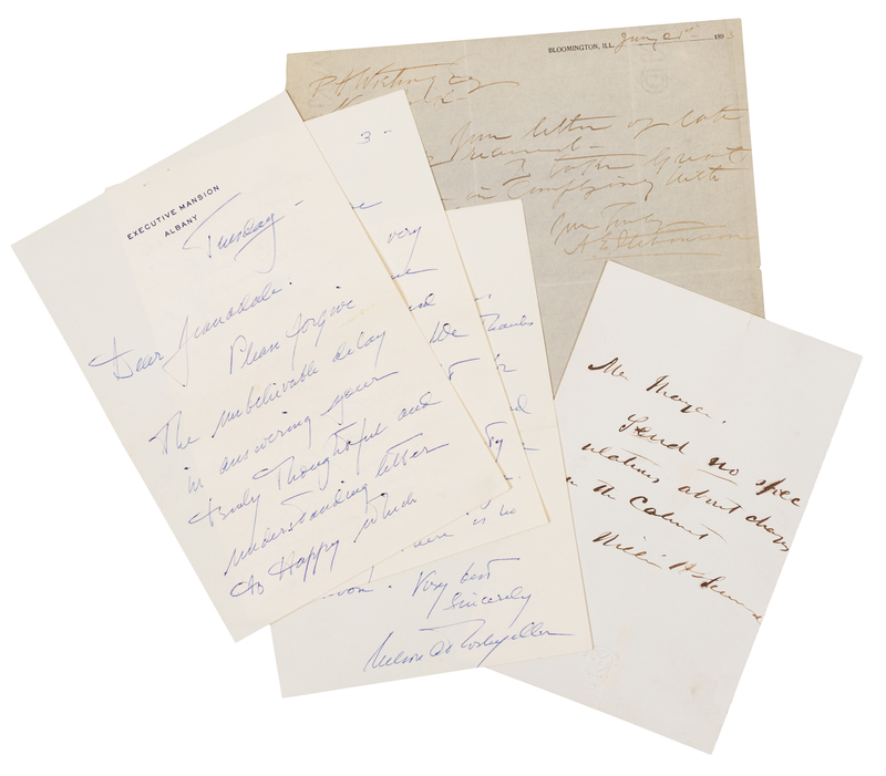 ROCKEFELLER, Nelson A. (1908-1979). Autograph letter signed ("Nelson A. Rockefeller), as Governor of New York, to Jeanadale, Albany, Tuesday (n.d.). 6 pages, 8vo, on Executive Mansion stationery, staple holes in top margin not affecting text, a few tiny stains touching two words. Thanking Jeanadale (presumably) for her supportive note regarding his second marriage, and writing that he and his second wife, Mary Todhunter Clark "have experienced very much the same reaction experienced by you & Ken." The couple faced scrutiny as it was Rockefeller's second marriage. -- SEWARD, William Henry (1801-1872). Autograph note signed ("William H. Seward"), as Secretary of State, to Mr. Mayer, n.p., n.d. 1 page, 8vo, on embossed stationery. "Send no speculations about charges in the Cabinet." -- STEVENSON, Adlai E. (1900-1965). Autograph letter signed ("A.E. Stevenson"), as Vice President, to P.A. Wieting, New York, 21 June 1893. 1 page, 4to, on Bloomington Ill. stationery, lightly penned, otherwise fine. Acknowledging receipt of Wieting's letter, and promising to comply with his request. -- Together, 3 manuscripts.