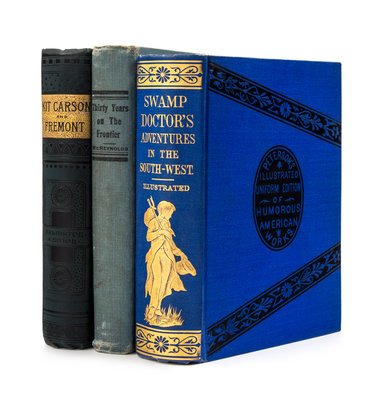 BRYAN, Daniel. The Mountain Muse: Comprising the Adventures of Daniel Boone and the Power of Virtuous and Refined Beauty. Harrisonburg: Printed for the Author by Davidson & Bourne, 1813. 12mo. Half-title. Contemporary calf. FIRST EDITION. Provenance: Ericson Public Library, Boone, Iowa (bookplate). -- CARSON, Kit and John C. Fremont. The Daring Adventures of Kit Carson and Fremont, Among Buffaloes, Grizzlies and Indians... New York: Hurst & Co., Publishers, 1885. 8vo. Frontispiece. Publisher's dark green cloth, black and gilt embossed lettering. "Arlington Edition." Provenance: Possible copy belonging to Albert Bernhardt Faust (1870-1951) from his days at St. Paul's Sunday School. Bernhardt Faust was a renowned German scholar and professor, most notably Cornell University. -- McREYNOLDS, Robert. Thirty Years on the Frontier. Colorado Springs: El Paso Publishing Co., 1906. 8vo. Frontispiece and 10 other photographic illustrations. Publisher's light blue pictorial cloth. FIRST EDITION, INSCRIBED BY McREYNOLDS on front pastedown. -- LEWIS, Henry Clay ("Madison Tensas"). "Swamp Doctor's" Adventures in the South-west Philadelphia: T.B. Peterson and Brothers, [1858]. Additional illustrated title-page, other numerous engraved plates. Publisher's blue cloth, black and gilt lettered covers and spine. Provenance: Bryant Circulating Library Association of Roslyn, New York (bookplate). -- Together, 4 works in 4 volumes, condition generally fine.