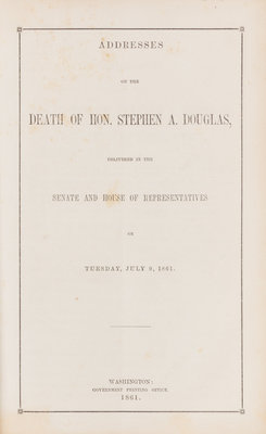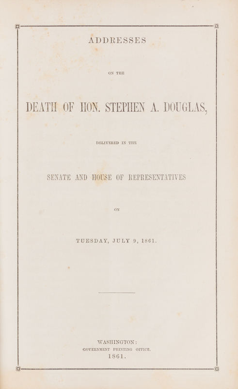 [SEWARD, WILLIAM]. Three campaign documents, including: Speech of William H. Seward, Delivered at Rochester, Monday, October 25, 1858. Gazette Campaign Documents No. 2. and Speech of Hon. William H. Seward, in the Senate of the United States, February 28, 1860. [with] Homesteads. The Republicans and Settlers Against Democracy and Monopoly. The Record. -- Minority Report of Mr. Stevens, Delegate from Oregon, Showing the Grounds Upon Which the Regular Southern Delegation were entitled to Seats in the Convention at the Front Street Theatre, Baltimore. Breckinridge and Lane Campaign Documents, No. 2. Washington City: Issued by the National Democratic Executive Committee, 1860. -- [BUCHANAN, JAMES]. Speech of President Buchanan, on the Evening of Monday, July 9, 1860. Breckinridge and Lane Campaign Documents, No. 4. Washington City: Issued by the National Democratic Executive Committee, 1860. -- [DOUGLAS, STEPHEN A.]. Addresses on the Death of Hon. Stephen A. Douglas, Delivered in the Senate and House of Representatives on Tuesday, July 9, 1861. Washington: Government Printing Office, 1861. -- Together, 6 pamphlets, condition generally fine.