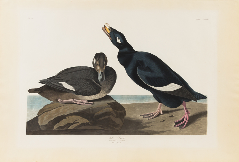 Velvet Duck (Plate CCXLVII)Fuligula fuscaEngraving with etching, aquatint and hand-coloring, ca 1835, on J Whatman Turkey Mill paper watermarked 1835, plate 20 3/4 x 30 1/4 in (25 3/4 x 37 7/8 in sheet), slight mat burn, some light chipping to edges, upper margin with sewing holes from binding, a few pin holes in extreme outer right margin, matted and framedLow p.118