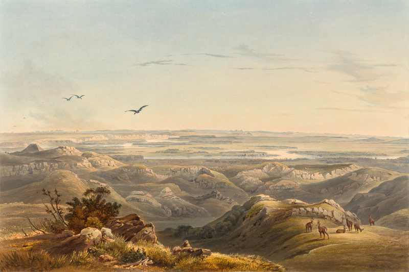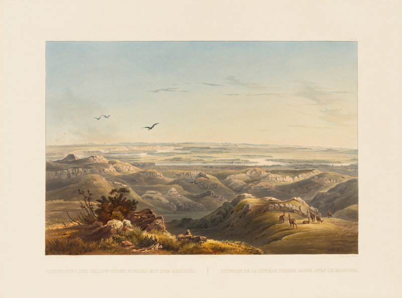 Junction of the Yellow Stone River with the Missouri (plate 29)From Travels in the Interior of North America, Coblenz and Paris, 1839-1842Aquatint engraving with hand-coloring, Bodmer blindstamp lower margin, title in French and German, plate 16 x 21 17/18 in (16 7/8 x 23 5/8 in sheet), on wove paper, discreet repairs to lower right corner, slight marginal chipping, hinged to mount, matted and framed