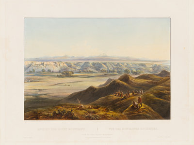 View of the Rocky Mountains (plate 44)From Travels in the Interior of North America, Coblenz, Paris, and London, 1839-1842Aquatint engraving with hand-coloring, Bodmer blindstamp lower margin, title in German, French and English, plate 16 3/8 x 21 1/8 in (25 3/4 x 37 7/8 in sheet), some light chipping to edges, more pronounced at lower corners, slight mat burn, some spotting, matted and framed