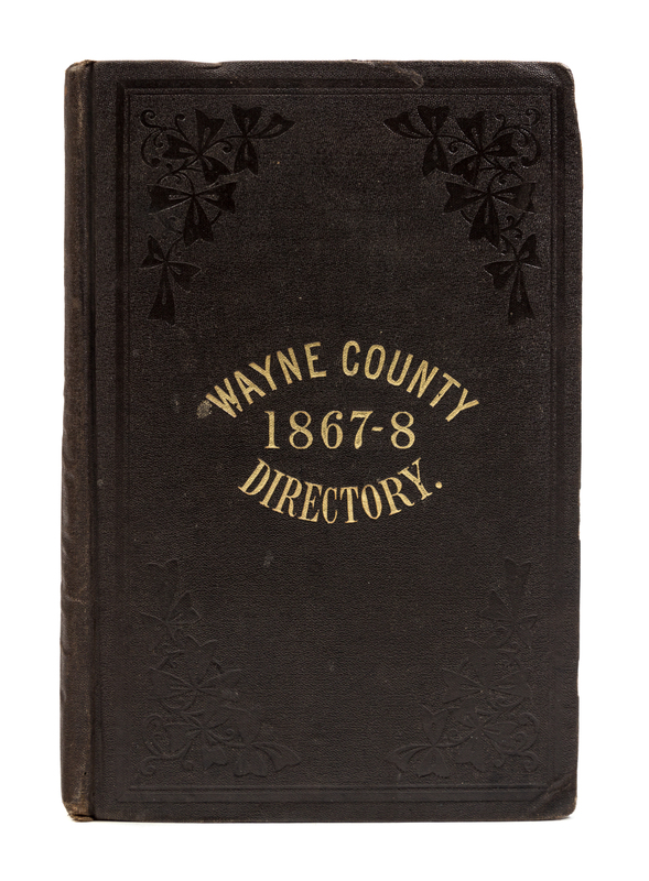 8vo (210 x 135 mm). 4 pages advertisements printed on blue paper, folding map of Wayne County, additional advertisements throughout occasionally printed on colored paper. (Some light offsetting.) Original brown cloth (some light wear, particularly to edges and corners). Palmyra, in Wayne County, is the birthplace of Mormonism. Though many Mormons were well-established in Utah by 1867, the Directory includes a 4-page excoriation of Mormonism, concluding: "Not a soldier was sent out, not a dollar was given, to aid the Union cause. No doubt the 'prophets' saw that in the future, the same power which was wiping the stain of slavery from our national life, would raise its arm to strike down polygamy. May the vision prove a true one."