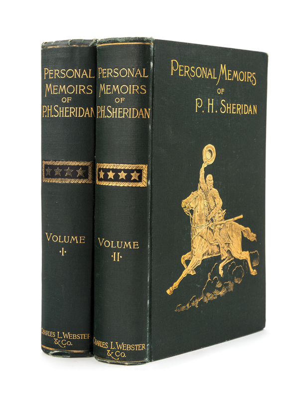 2 volumes, 8vo (230 x 143 mm). Portrait frontispieces, numerous illustrations, portraits and maps, some folding. (offsetting or spotting, a few light stains.) Publisher's green pictorial gilt-stamped cloth (wear to extremities, corners bumped, hinge starting). FIRST EDITION. Sheridan was a Union general in the Civil War and his career was noted for his rapid rise to major general as well as his close association with Lt. Gen. Ulysses S. Grant.