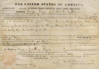 1 page, large 4to, on vellum, with official paper seal, matted and framed, creased, a few spots. Counter-signed by Thomas Ewing, Secretary of the Interior, and S. H. Laughlin. Granting land in DeKalb County Illinois to Joseph Taylor.
