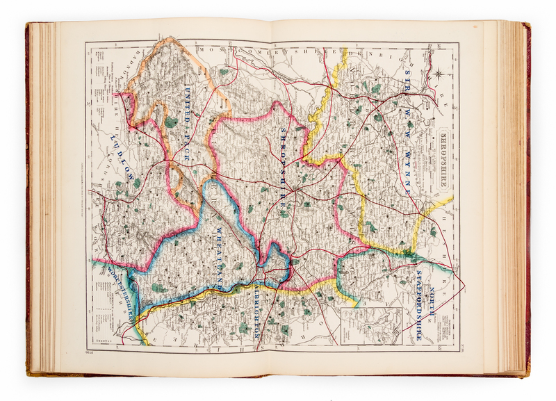 Folio (368 x 242 mm). 42 engraved or lithographic double-page maps hand-colored in outline, hunts stamped in blue on the image, text leaves and maps mounted on stubs. (Some minor browning or staining.) Contemporary half red straight grained morocco, gilt-stamped red cloth-covered boards (some overall staining and wear, upper hinge broken). FIRST EDITION.