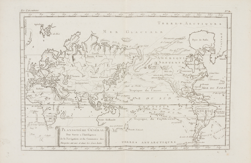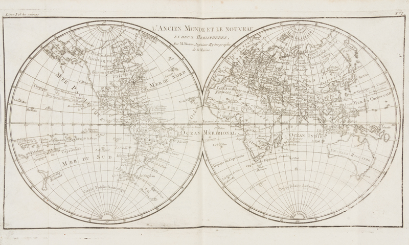 4to (259 x 207 mm). Half-title, letterpress list of plates, 28pp. text, 50 engraved maps, 23 letterpress tables (most folding). (Some very minor spotting or offsetting.) Contemporary blue silk-covered boards (spine defective). A fine copy of the atlas to accompany Raynal's L'Histoire Philosophique et Politique des Etablissemens et du Commerce des Europeens dans les Deux Indes, comprising maps by Bonne engraved by Andre. The map of North America is mostly blank west of the Mississippi River, and the maps of Mexico and the southwest include detailed information about the Jesuit missions.