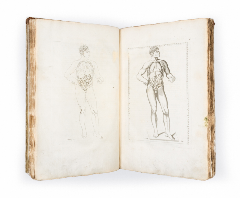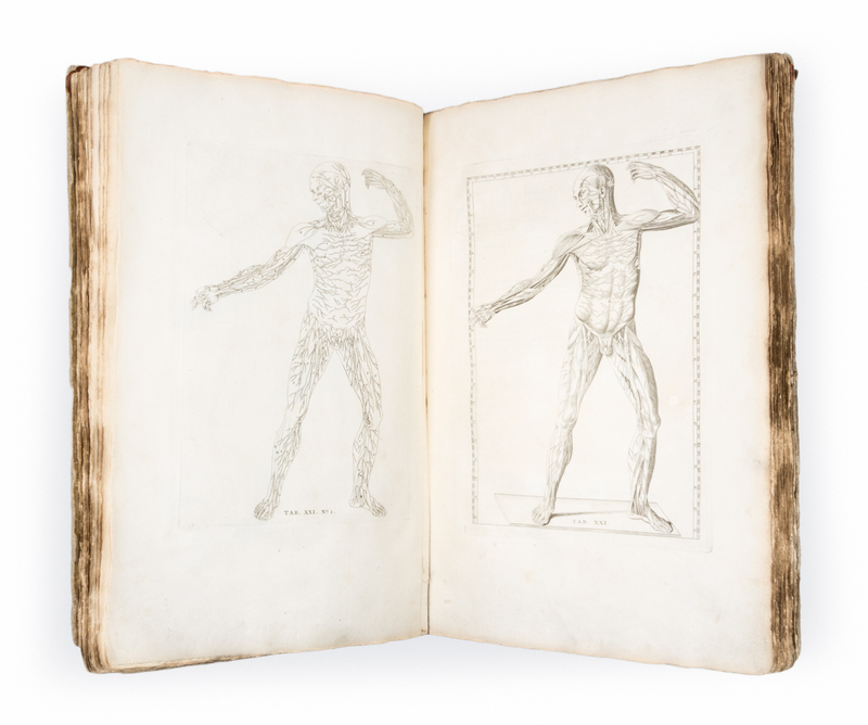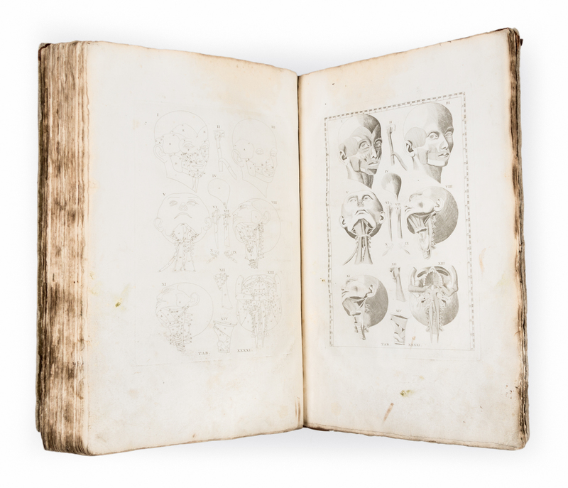 Folio (435 x 270 mm). Half-title, title printed in red and black with engraved vignette, 47 plates with duplicates in outline (totaling 89). (Lacking engraved frontispiece, a few plates disbound, some minor spotting or soiling.) Contemporary boards, modern leather rebacking (some overall wear to boards). Second edition. Eustachius finished his copper plates in 1552, but only a few were published in his lifetime. The plates were rediscovered and published in full in the first edition (Rome, 1714).