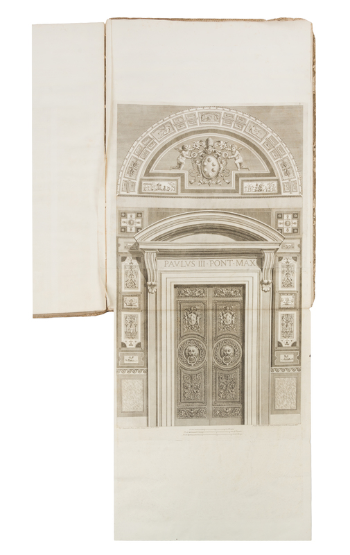 Volume I only (of 3), broadsheet folio (text leaf 752 x 468 mm, plates approximately 1130/478 x 453/1356 mm, binding 665 x 460 mm). Engraved plate with title, text leaf printed within a double-rule border, 17 engraved folding plates (one printed on 3 sheets, the rest printed on 2 sheets). (Some very pale spotting.) Contemporary paste-paper covered paper-backed boards, manuscript label on upper spine (some chipping to spine and light wear to extremities). Numerous works were published in the 17th century to illustrate Raphael's work, but "the present work was the first to attempt to show all the decoration of the pilasters and pillars" (RIBA). A FINE WIDE-MARGINED COPY IN A CONTEMPORARY BINDING.