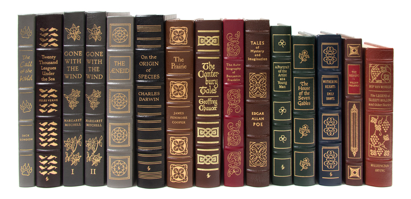 BRONTE, Emily. Wuthering Heights. -- CHAUCER, Geoffrey. The Canterbury Tales. -- COOPER, James Fenimore. The Praire. -- DARWIN, Charles. On the Origin of Species. -- DRYDEN, John, translator. Virgil: The Aeneid. -- FAULKNER, William. The Reivers. -- FRANKLIN, Benjamin. The Autobiography of Benjamin Franklin. -- HAWTHORNE, Nathaniel. The House of Seven Gables. -- IRVING, Washington. Rip Van Winkle, The Legend of Sleepy Hollow, and Other Stories. -- JOYCE, James. A Portrait of the Artist as a Young Man. -- LONDON, Jack. The Call of the Wind. -- MITCHELL, Margaret. Gone With the Wind. 2 volumes. -- POE, Edgar Allan. Tales of Mystery and Imagination. -- VERNE, Jules. Twenty Thousand Leagues Under the Sea. -- With approximately 60 others. All in original bindings, edges gilt, condition fine. Complete list available upon request.