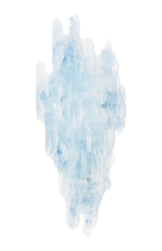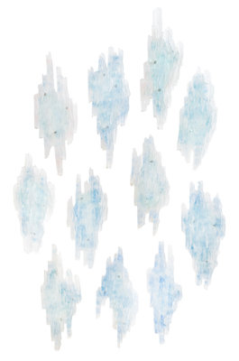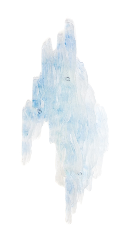 a hanging sculpture, comprised of 11 molded glass tiles hanging from steel bars