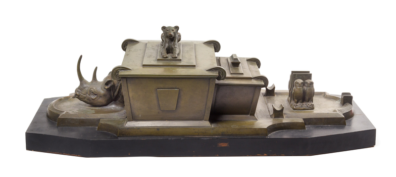 a sculpted figural humidor, 1927the lid surmounted with a lion, the body set with a rhino and owls