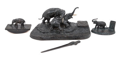 Letter opener: Length 11 inchesMatch box holder: Height 4 1/2 x width 7 1/2 x depth 5 inchesBlotter: Height 4 1/2 x width 7 x depth 3 1/4 inchesInk well: Height 8 x width 18 x depth 9 inches