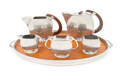 a tea and coffee service, comprising a tea pot, coffee pot, creamer, sugar, covered dish and tray