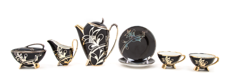 a coffee service, comprising a coffee pot, creamer, sugar dish and two cups with saucers