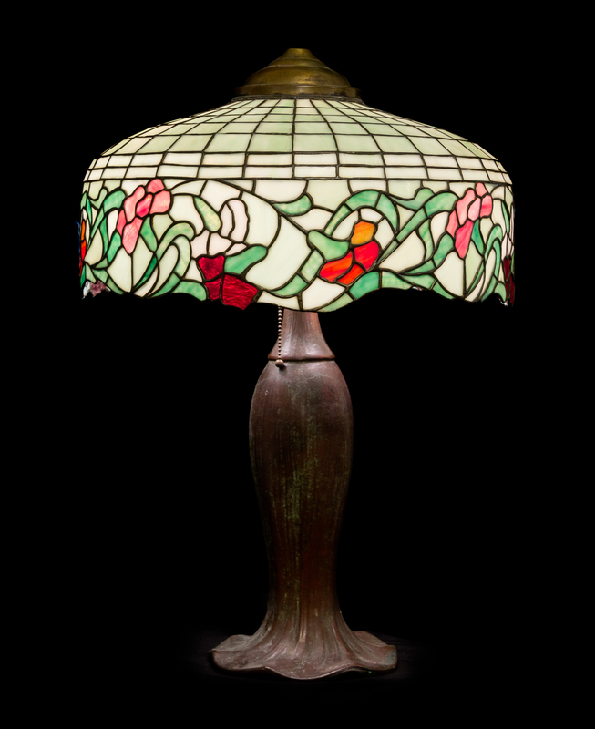 a leaded glass table lamp, having a domed shade with foliate decorated lower border, raised on a baluster form base