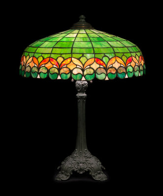 a leaded glass table lamp, the domed shade with floral lower border, raised on a cast metal base