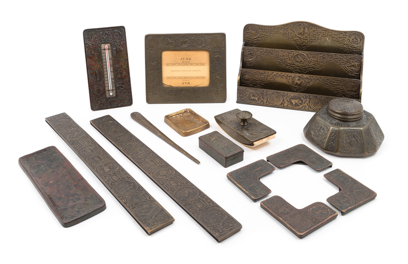 a Zodiac pattern desk set, comprising an inkwell (1072), letter rack (1030), blotter ends (988), pen tray (3660), picture frame/calendar (943), thermometer, four blotter corners, rocker blotter (990), a small covered box (802), a small dish (376) and a letter opener