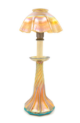 a Favrile glass candlestick lamp, in gold iridescence, having ruffled shade and twist base