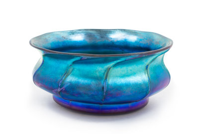 a Favrile glass bowl, of low form, decorated with blue iridescence