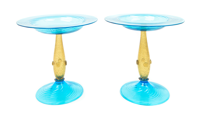 two celeste blue glass compotes, form no. 6043, with mica flecked amber stems and applied prunts to stem