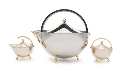 Teaball teapot, together with an associated creamer and covered sugar