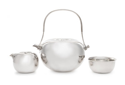 a tea service, comprising a teapot, creamer and sugar