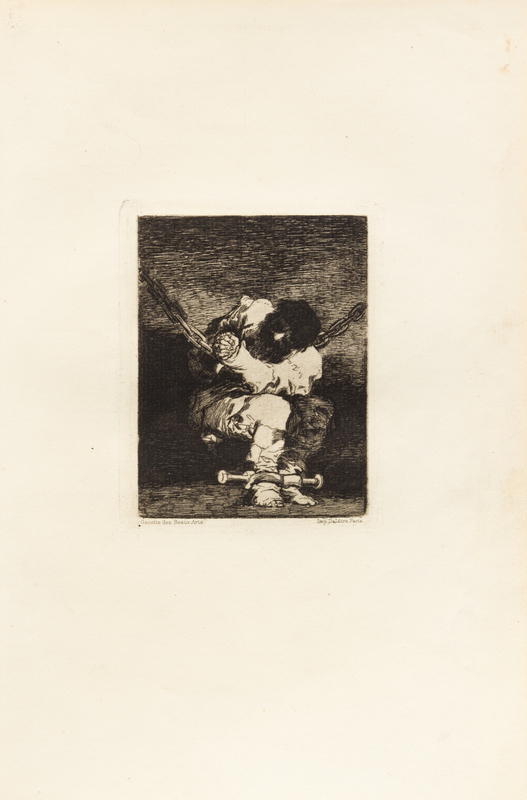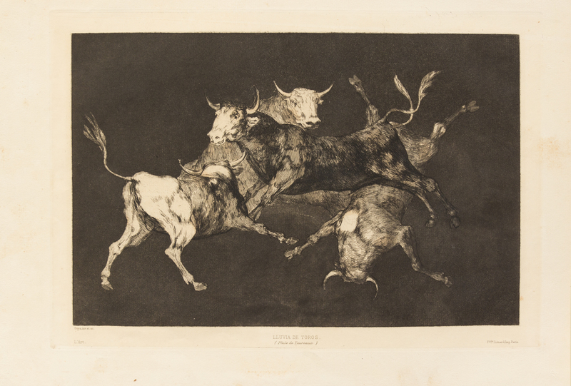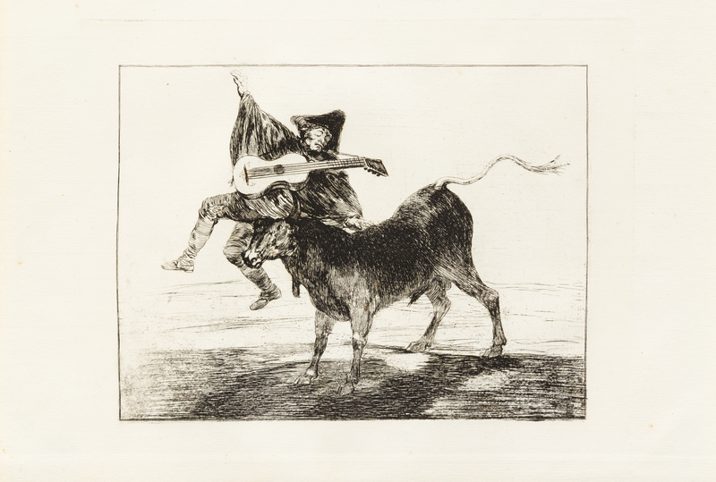 A group of 3 prints including Tan brbara la Seguridad come el Delito ('The Little Prisoner'), c. 1820; Dios se lo pague a usted ('Blind Man tossed on the Horns of a Bull'), c. 1800-1808; and Al Toro y al Aire Darles Calle (Lluvia de Toros), c. 1824