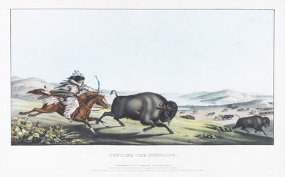 lithograph with handcoloring,"Hunting the Buffaloe" fromHistory of the Indian Tribes of North America, published by E.C. Biddle, Philadelphia, 1837