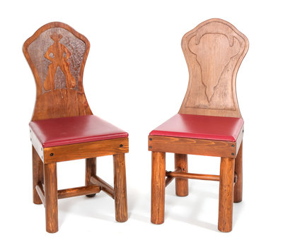 with chairback carved in relief, one featuring a cowboy and the other the head of a steer